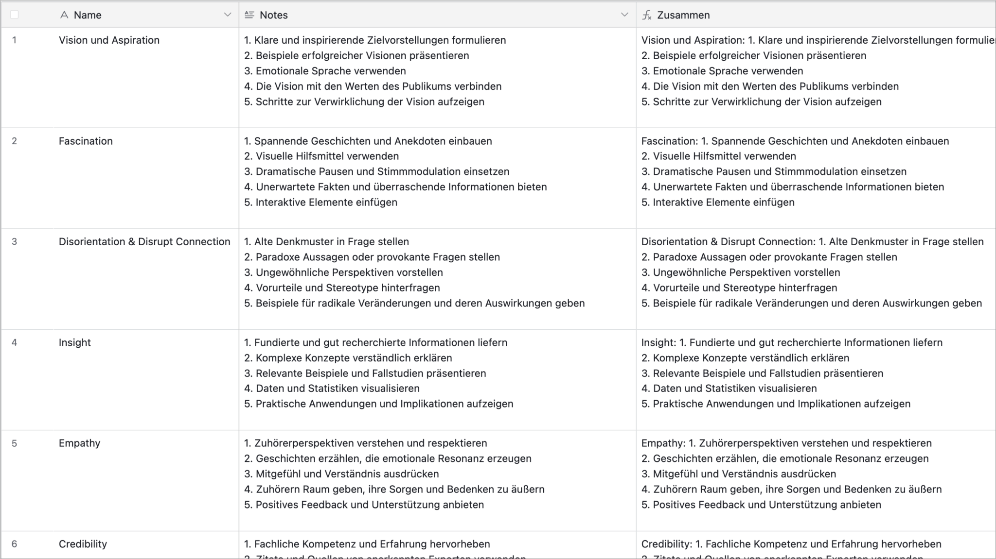 Rahmenbedingungen Zielgruppen (z. B. Coaches, Creators, Marketer), Anwendungskontexte (Website, Social Media, E-Mail), Unternehmensansprache (Du/Sie) Legt fest, wen du ansprichst und wo. Ermöglicht dir, unterschiedliche Formate (z. B. B2B-Pitch vs. Social-Post) konsistent zu gestalten.